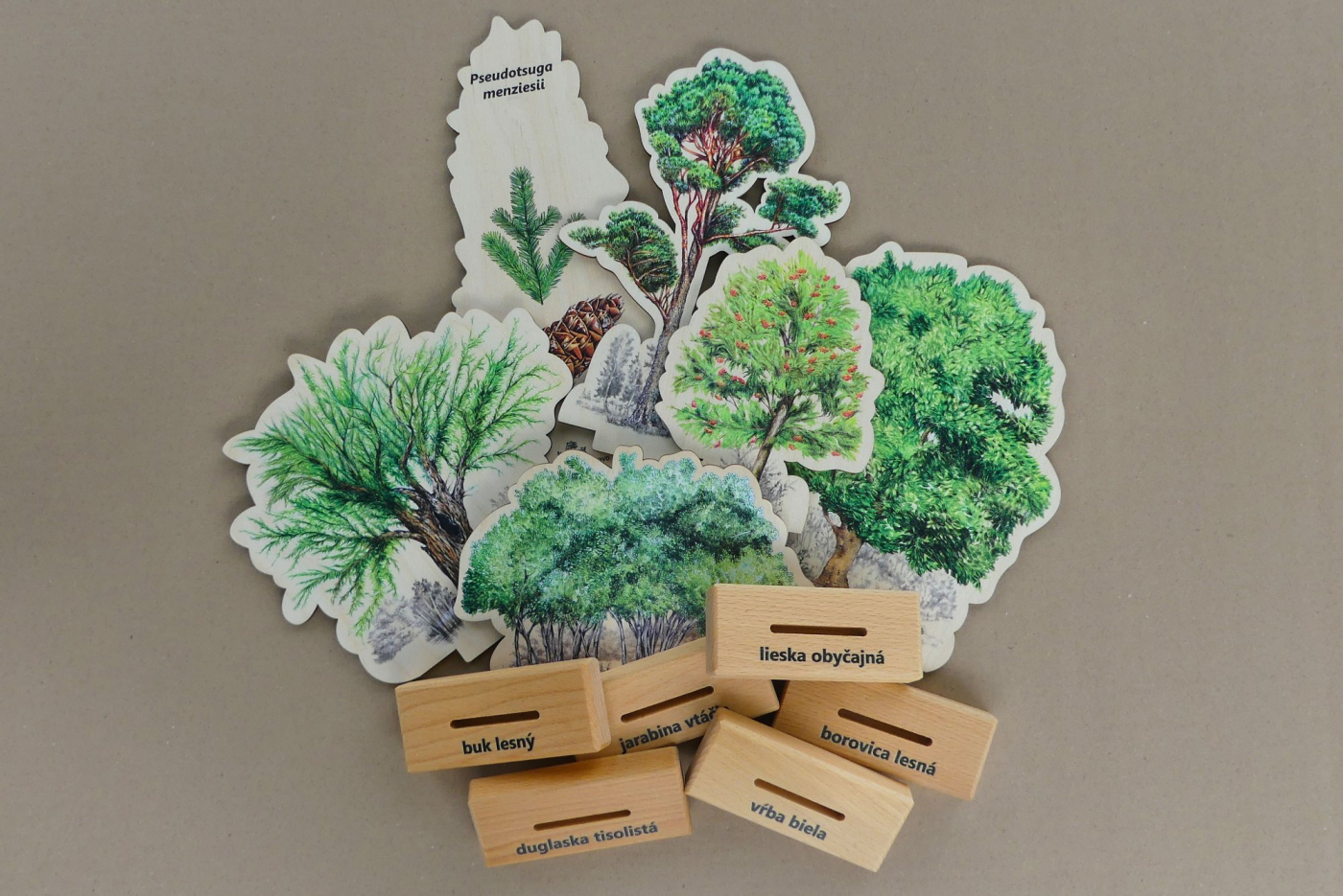 Súpravu Spoznávaj stromy vyrábajú v našej dielni české ruky z kvalitného českého certifikovaného dreva. Balenie obsahuje 22 stromov, makety sú z preglejky s veľkosťou 20 – 35 cm. Balené v kartónovej škatuľke. Autori kresieb sú českí ilustrátori, obrázky sú chránené autorskými právami. Súprava Spoznávaj stromy zábavnou a hravou formou zoznamuje deti aj dospelých s prírodou. Maketa je oddeliteľná od podstavca, ktorý je z masívu. Na podstavci je uvedený slovenský názov stromu. Na zadnej strane makety sú latinský názov a obrázky listu a plodu. DRUHY STROMOV: borovica lesná, buk lesný, duglaska tisolistá, javor mliečny, jedľa biela, pagaštan konský, lipa malolistá, smrekovec opadavý, smrek obyčajný, jelša lepkavá, jaseň štíhly, dub letný, breza previsnutá, hrab obyčajný, lieska obyčajná, agát biely, borovica hladká, vŕba biela, brest väzový, tis obyčajný, jarabina vtáčia, topoľ osikový. Lesný svet = značka s ekologickým certifikátom udržateľného hospodárstva PEFC. Všetky produkty sú vyrobené s ohľadom na životné prostredie.