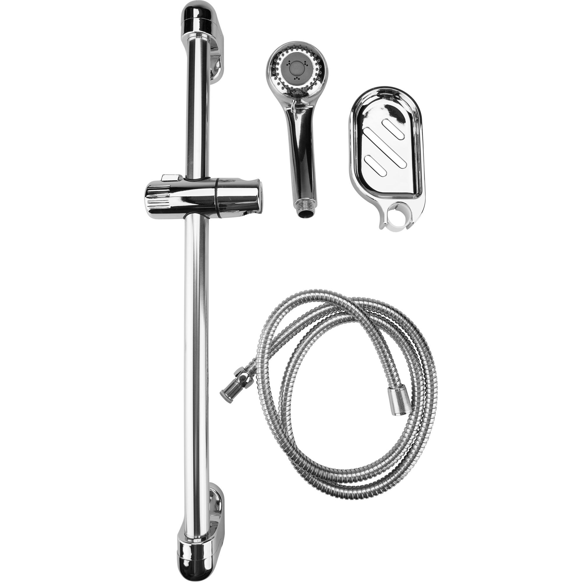 Sprchová sada BALLETTO – elegantní a komfortní sprchováníModerní sprchová sada BALLETTO přináší spojení funkčnosti a elegantního designu pro pohodlné každodenní sprchování. Díky velké hlavové sprše a praktické ruční sprše si můžete dopřát osvěžující zážitek podle svých představ. Sada je ideální pro renovace i nová koupelnová řešení.Hlavní vlastnosti:• Velká hlavová sprcha – široký proud pro příjemné osprchování celého těla• Ruční sprcha – flexibilní použití, snadné čištění a manipulace• Nastavitelná výška a držák – pohodlné přizpůsobení podle potřeby• Lesklý chromový povrch – elegantní vzhled, snadná údržba• Kompletní příslušenství – včetně hadice a upevňovacích prvkůSprchová sada BALLETTO je skvělou volbou pro každého, kdo hledá komfortní a stylové řešení do koupelny za příznivou cenu.Délka tyče:51 cmPrůměr tyče:2,5 cmRozteč úchytů:55 cmMateriál:kov + plastExtra:sprchová hlavice 3 polohy, hadice NEREZ 150 cm, plastová mýdlenka