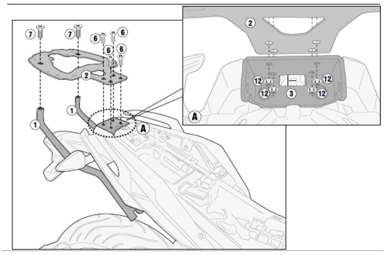 Special rack pro horní kufr. Pro montáž kufru kupte plotnu samostatně. Pro kufry řady MONOKEY použijte plotnu M5, M7, M8A nebo M8B, pro kufry řady MONOLOCK pak plotnu M5M nebo M6M. Max. zatížitelnost je 6 kg.