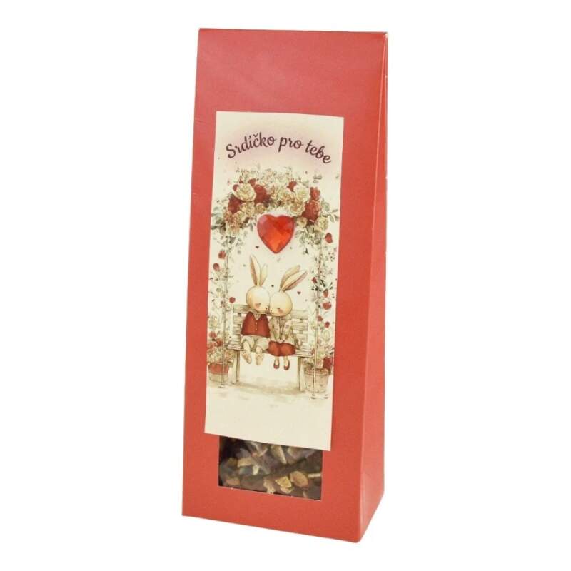 Ovocný čaj v dárkové krabičce s motivem zamilovaných zajíčků sedících na lavičce a dekorací srdíčka. Motiv dekorace se může lehce lišit od fotografie podle aktuálních zásob. Text: Srdíčko pro tebe Složení: ibišek, jablko, pomerančová kůra, šípek, přírodní aroma.