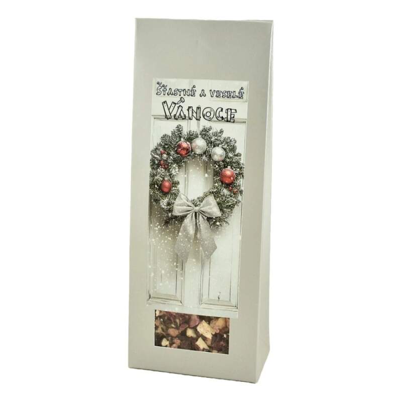 Sypaný ovocný čaj v dárkovém balení 50g Ovocný čaj v dárkové krabičce s motivem vánočního věnce a stříbřité mašle. Složení: šípek, ibišek, pomerančová kůra, jablko, aroma.
