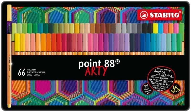 STABILO Pen 68 prémiový fix ARTY kovový box 65 různých barev. Prémiový fix STABILO Pen 68 je příslibem nekonečné kreativity – není divu, že dokonale ladí se současnými trendy v Bullet Journalingu, náčrtech nebo ručním psaní. Příznivci mandal, malby a kresby jsou nadšení z všestrannosti jeho kvalitního vláknového hrotu. Kreativní a hobby umělci milují velkou rozmanitost, kterou STABILO Pen 68 poskytuje a díky které je možné pestře realizovat každý nápad. Robustní hrot fixu zajišťuje rovnoměrné nanášení barvy a je ideální pro kresbu výrazných čar a pro vybarvování ploch. Vláknový fix STABILO Pen 68 může být až 24 hodin ponechán bez víčka, aniž by vyschl – což je perfektní, pokud váš kreativní projekt zabere více času.