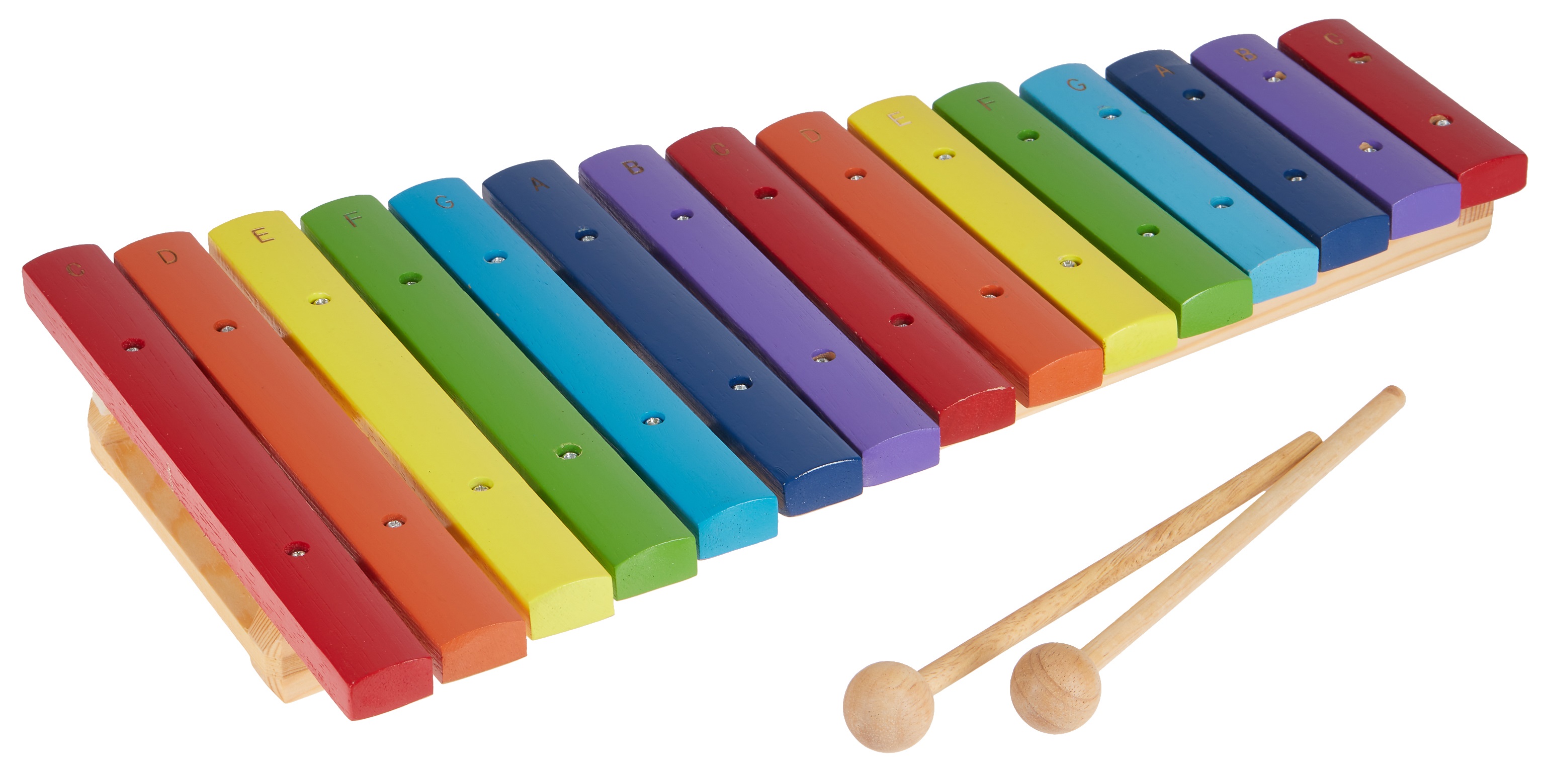 Xylofon Dřevěný xylofon s barevnými kamínky vhodný pro hudební výchovu a rozvoj motoriky dětí. Rám nástroje je vyroben z borovice a jednotlivé kameny z modřínu. Všechny barevné kameny jsou označeny příslušným tónem, rozsah xylofonu jsou dvě oktávy (15 kamenů). S nástrojem je dodáván pár dřevěných paliček.