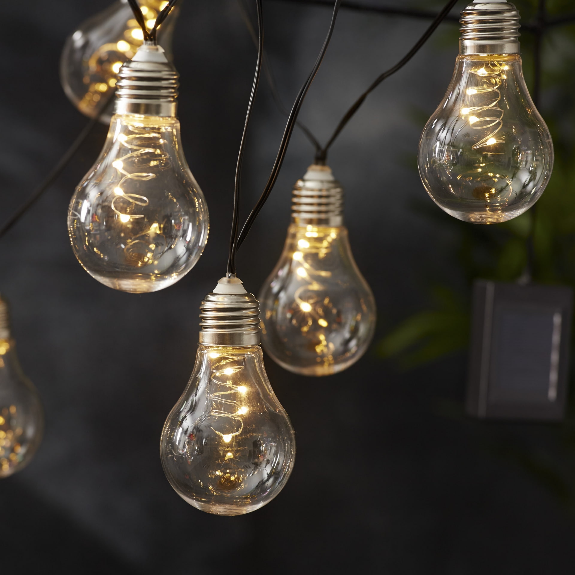 Řetěz s černým kabelem má 10 čirých plastových žárovek typického tvaru se stříbrnou objímkou - uvnitř každé je drátek s LED světýlky, které vydávají jasné žluté světlo.