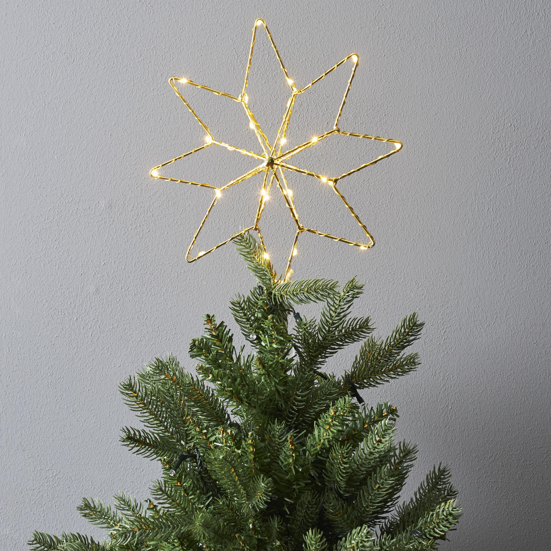 Hvězda od Star Tradingje určená na ozdobení špičky vánočního stromečku. Je omotaná světelným drátkem s 28 nevyměnitelnými LED žárovičkami s životností až 7000 hodin, které vyzařují teplé bílé světlo. Napájení je na 3 AA baterie, které nejsou součástí balení. Hvězda má také funkci časovače - při jeho zapnutí svítí 6 hodin, poté sama zhasne a za 18 hodin se znovu rozsvítí.