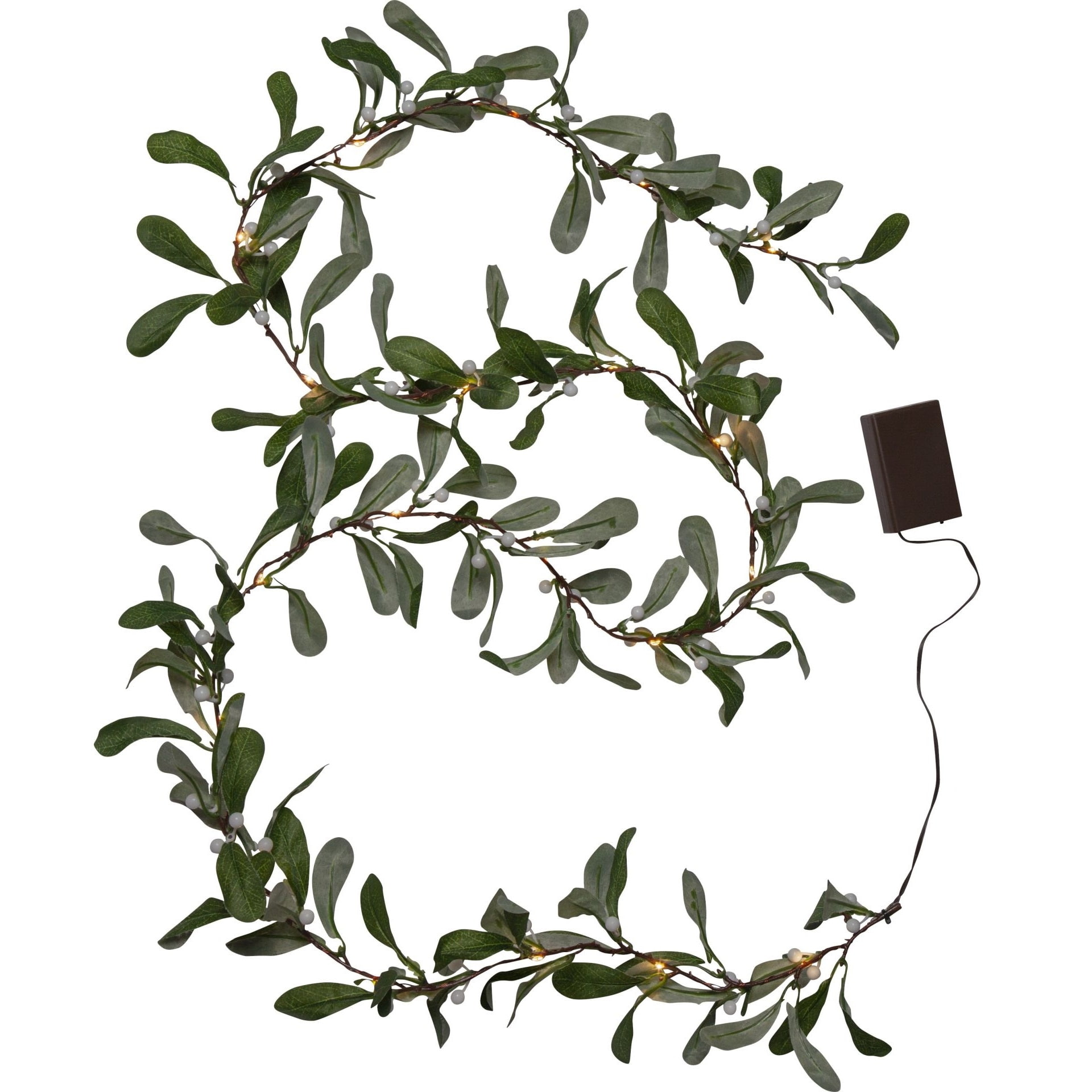 STAR TRADING Vánoční LED girlanda Mistle 180 cm, zelená barva, plast. Položte na prostřený stůl girlandu, která věrně imituje skutečné jmelí. Je však o kapku lepší v tom, že dokáže vykouzlit příjemné světlo a sváteční atmosféru. Girlanda od Star Trading je osazená dvaceti LED světýlky po celé své délce, které svítí teplým bílým světlem. Girlandu můžete využít také na parapetu nebo ji uchytit okolo okenního rámu. Uvidíte, že si ji zamilujete.