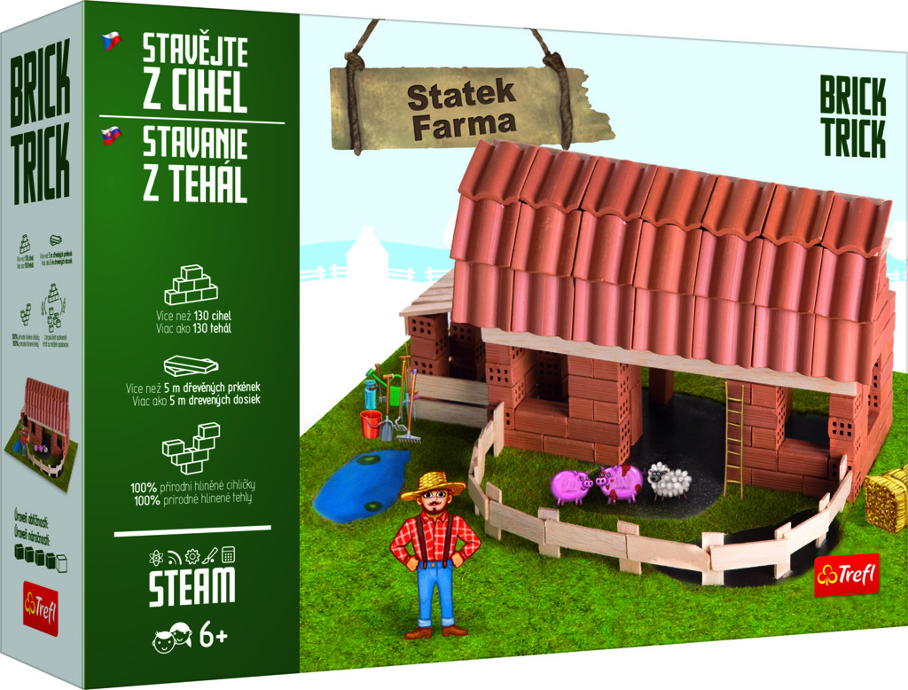 Staňte se stavitelem a vybudujte ze skutečných hliněných cihel a dřeva svůj vlastní statek! Skládejte cihlu za cihlou, řežte a lepte prkénka, postupujte od základů až po dokončenou budovu a nakonec svůj výtvor ozdobte přiloženými dekoracemi. Stavte krok za krokem podle návodu nebo najděte a zrealizujte své vlastní řešení. Oživte svou dokončenou stavbu papírovými figurkami. Pokud spojíte několik sad TREFL Brick Trick, můžete vytvořit malebnou vesničku, moderní město nebo středověkou osadu. Stavebnici lze používat opakovaně (lepidlo je rozpustitelné vodou). Úroveň obtížnosti: 4/5 Balení obsahuje: více než 130 přírodních hliněných cihliček více než 5 m dřevěných prkének základovou desku obrázkový návod papírové figurky dekorační doplňky lepidlo Stavebnice Brick Trick od výrobce TREFL zlepšují manuální dovednosti, rozvíjí představivost a podporují soustředění. Vhodné pro děti od 6 let.
