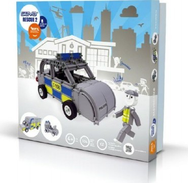 "Pif, paf... Pomóóóc" Lupič přepadl banku a utíká. Neváhejte. Nasedněte rychle do policejního auta a chytněte ho. Stavebnice SEVA Rescue 2 obsahuje 534 speciálních reflexních dílků, ze kterých si můžete postavit policejní auta apod. Součástí balení je i panáček Seváček. Rozměr krabice: 35 x 33 x 8 cm Vhodné od 4 let