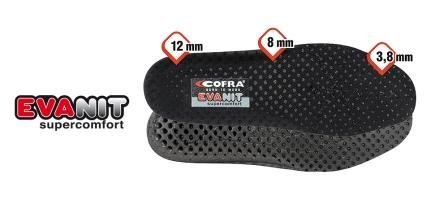 - Vložka z EVA a nitrilu speciální směsi, s vysokou nosností a proměnnou tloušťkou. Tepelně tvarovaný, děrované a potažené vysoce prodyšného materiálu.Antistatické díky specifickou léčbu na povrchu a na švy vyrobené z vodivých přízí