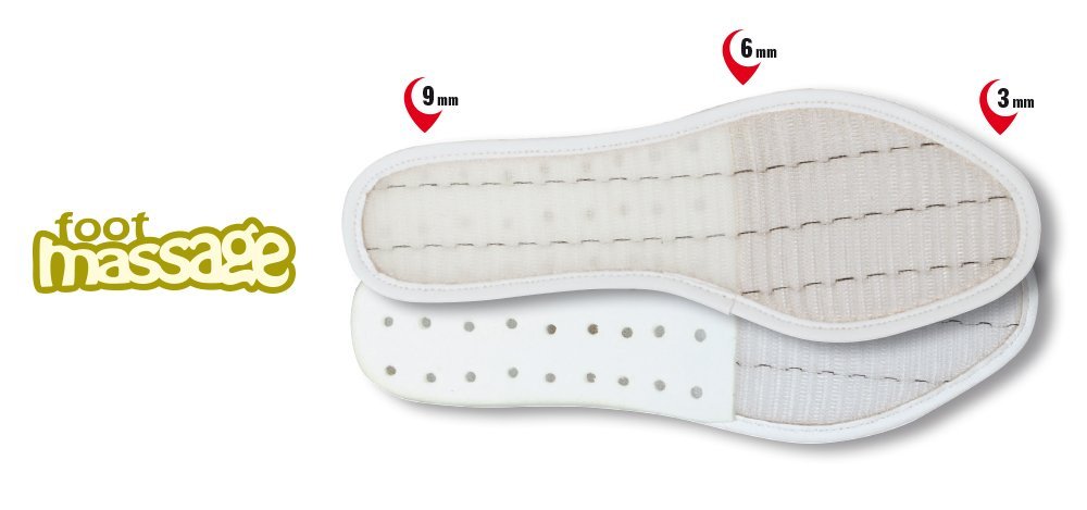 - Struktura vyrobená z nylonu, s vyztuženou klenbou, která zaručuje neustálou cirkulaci vzduchu a udržuje chodidlo vždy svěží a suché. Zvlněná plocha rovněž zaručuje konstantní masáž nohou, která snižuje únavu, stimuluje krevní oběh a zabraňuje tvoření kuřích ok. Měkký polyuretan poskytuje podporu pro chodidlo a absorbuje energii nárazu. Antistaticita je zaručena kovovým vláknem uvnitř struktury.