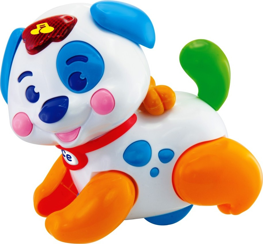 Interaktivní štěňátko pro ty nejmenší. Štěňátko má několik funkcí, vydává různé zvuky, svítí. Pokud štěňátko zmákneš, ono půjde. Pejsek má obojek a na něj mu můžeš nalepit samolepku a napsat mu tam jeho jméno.Hračka obsahje také regulátor zvuku. Výrobek je vhodný pro děti od 12 měsíců. Vyžaduje 2 AG13 baterie.