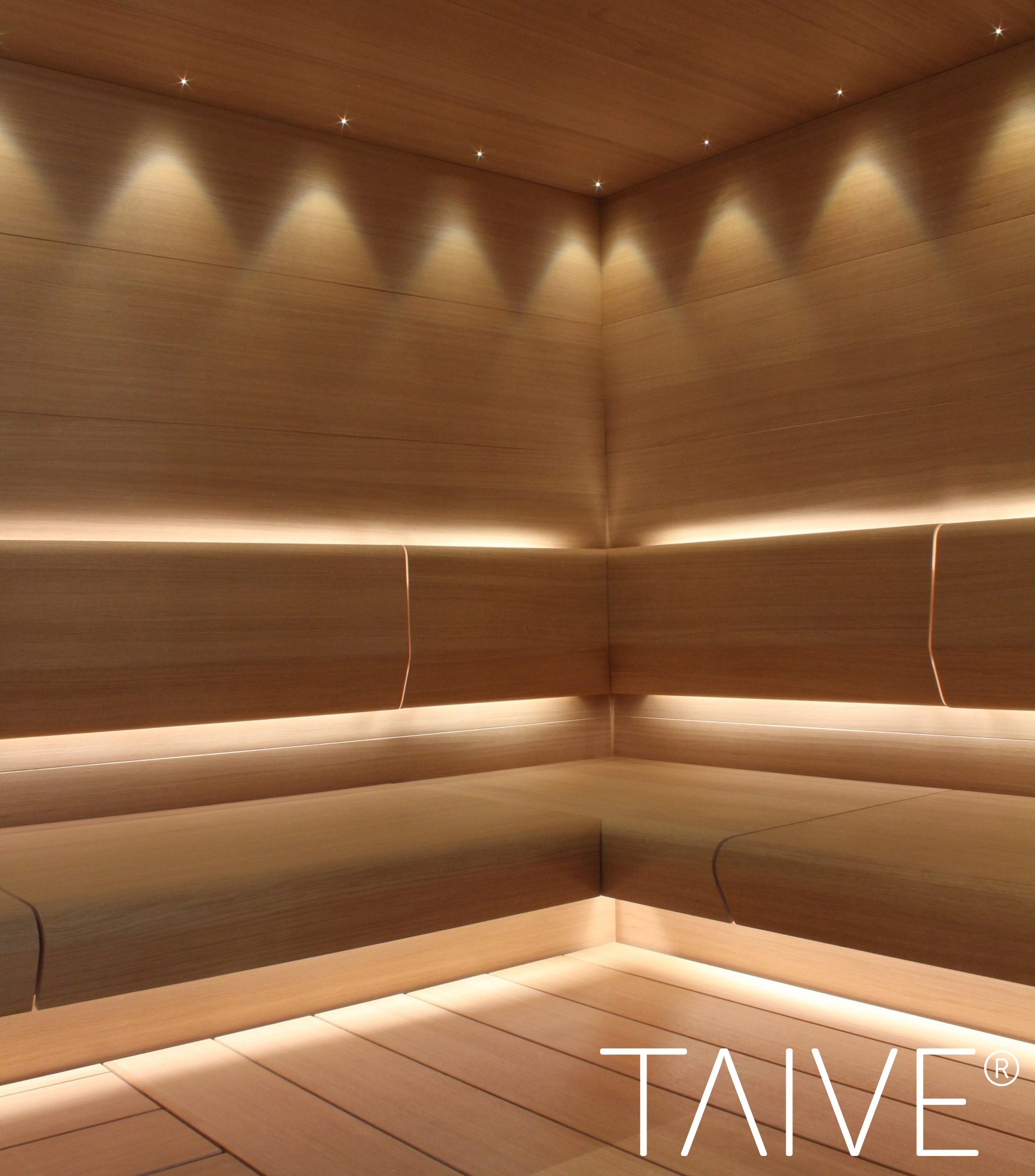 Saunové produkty TAIVE® poskytují kompletní řešení pro interiér sauny a váš zážitek ze saunování posunou na zcela novou úroveň. Hladký a elegantní design vám zajistí harmonickou atmosféru ve vaší sauně. Jsou vyrobeny z březové překližky. Osvětlení Cariitti navíc zvýrazňuje tvar a strukturu dřeva. Struktura a použitá bez emisní lepidla zaručují velmi vysokou odolnost tlaku a minimální deformace.