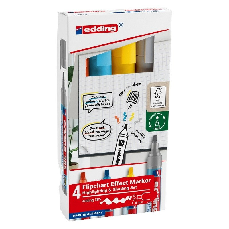 Stínovací popisovač edding 385 je především určený pro stínování či zvýraznění nápadů a témat při prezentacích - zlepšuje viditelnost důležitých faktů a závěrů. Inkoust byl speciálně vyvinut pro flipchartový papír a pro prezentační karty, je však vhodný i pro nejrůznější kreativní činnosti na papíru vyšší gramáže. Inkoust na vodní bázi nabízí intenzivní barvy. Flexibilní hrot umožní stínování a akcentování textu, grafů či náčrtků. Cap-off inkoust nevyschne i několik dnů, pokud je popisovač ponechán bez víčka. Napsaná stopa rychle zasychá a nepropíjí se. Popisovač je znovu naplnitelný, prodloužením jeho životnosti pomůžete snížit množství komunálního odpadu. Tělo popisovače je vyrobeno z 55 % z recyklovaného plastu. Klip na víčku brání skutálení popisovače. Flexibilní kaligrafický hrot. Šíře stopy: 1-5 mm. Sada obsahuje 4 výrazné barvy: žlutou, oranžovou, tyrkysovou a stříbrošedou. Vyrobeno v Německu.