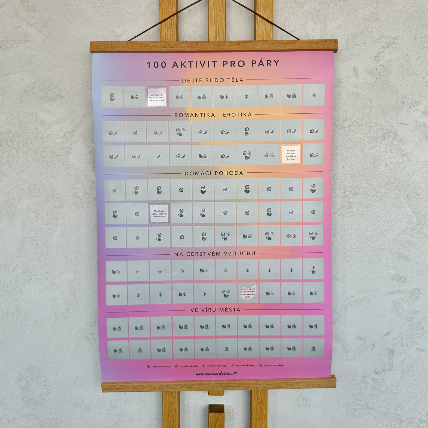 Stírací plakát se 100 aktivitami pro páry rozdělených do 5 kategorií. Balení obsahuje: stírací plakát, dřevěný magnetický rám (41 cm), škrabátko.