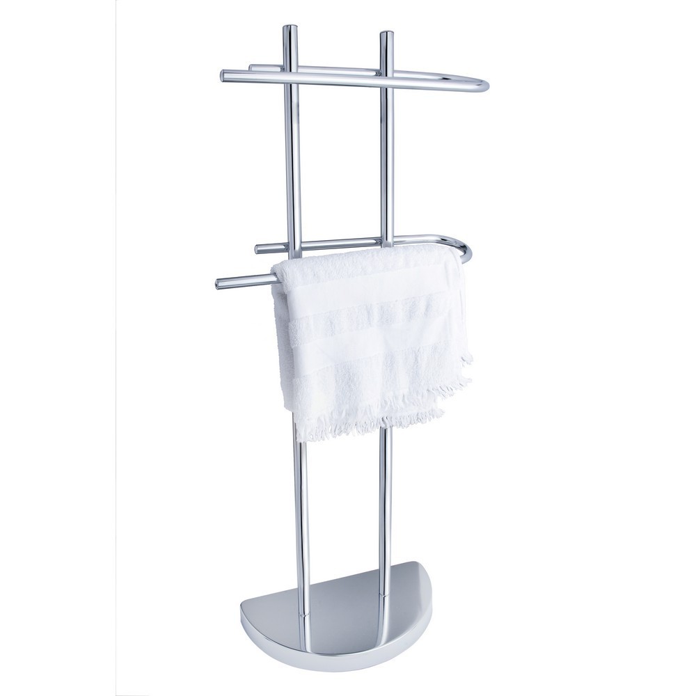 Samostatně stojící koupelnový věšák z vysoce lesklé chromované oceli. Základna je navržena ve tvaru půlkruhu, takže ji lze pohodlně přisunout ke stěně, aby zabírala méně místa. Výrobek vyžaduje vlastní montáž.