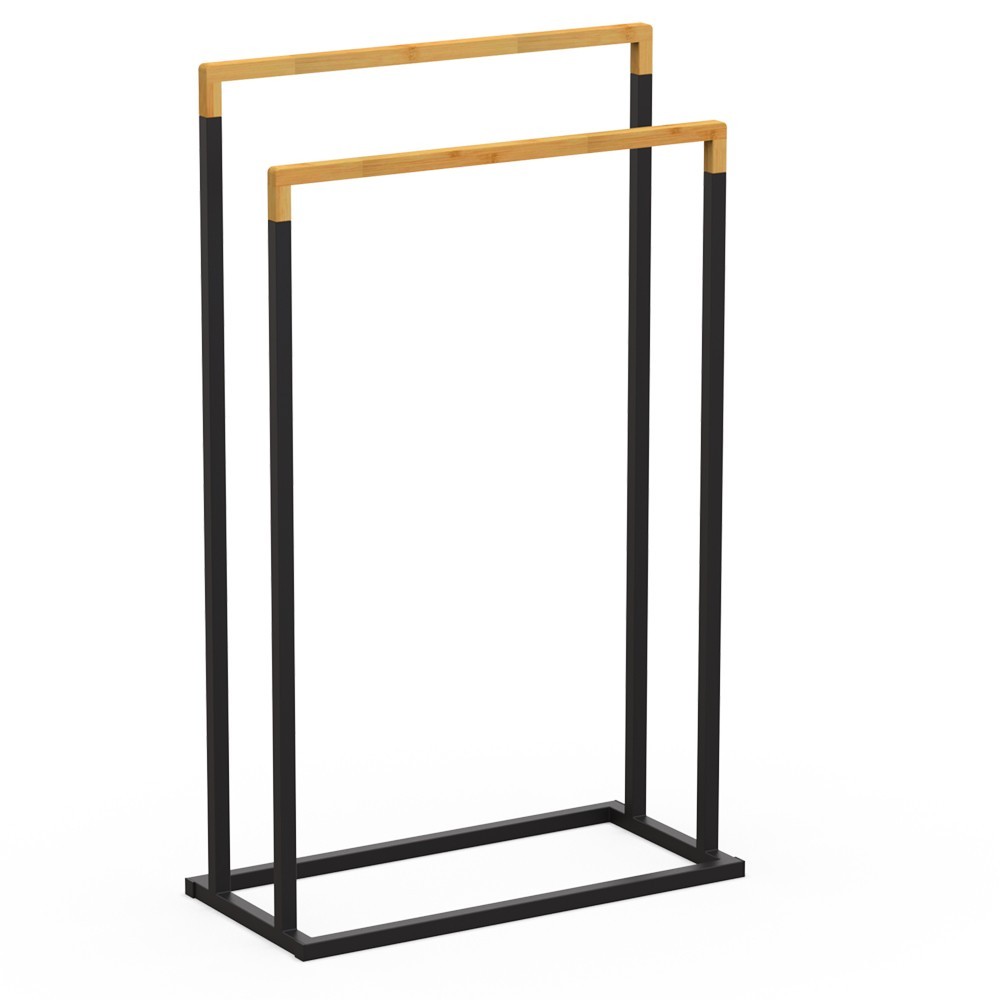 Moderní stojící věšák na ručníky se dvěma rameny, navržený v jednoduché geometrické formě. Je vyrobena z černě lakované oceli s matným povrchem a na výrobu paží bylo použito přírodní bambusové dřevo. Stojan na ručníky má stabilní základnu zajištěnou plastovými nožičkami. Výrobek vyžaduje vlastní montáž.