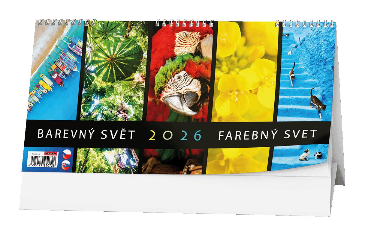 Stolní kalendář se čtrnáctidenním kalendáriem a pestrobarevnými motivy. Papír: G print, 100 g/m2 Obálka: křída lesk 135 g/m2 Stojánek je z kvalitní bílé lepenky 600 g/m2 Dělená kovová spirála "twin wire"   Možnosti potisku kalendáře Kalendář je možné nechat individuálně potisknout. Potisk se provádí na stojánek (na jednu nebo obě strany) různými způsoby dle složitosti a barevnosti loga či obrázku. Používá se digitální tisk, sítotisk, stejně jako nalepení potisku. Možné jsou i další úpravy jako třeba výměna titulní strany za vaši reklamní. Základní potisk se obvykle provádí pro minimální počet 50 ks kalendářů. V případě zájmu o jakoukoliv úpravu nás kontaktujte na e-mail zobac@papirnictvioskarek.cz nebo telefonicky na tel. 608 939 293. Rádi s Vámi probereme veškeré možnosti. Zakupte produkt Stolní kalendář 2026 Baloušek - Barevný svět z kategorie Kalendáře, diáře | Stolní kalendáře 2026 | Obrázkové | Baloušek od výrobce Baloušek za cenu 46.9 Kč.