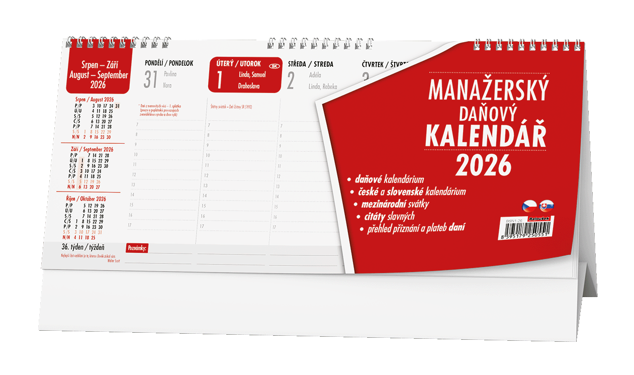 Manažerský pracovní kalendář s týdenním kalendáriem a přehledem daňových termínů. Červeno-bílá barevná kombinace a citáty slavných oživí Váš den. Papír: ofset, 70 g/m2 Obálka: křída lesk 135 g/m2 Stojánek je z kvalitní bílé lepenky 600 g/m2 Dělená kovová spirála "twin wire" Možnosti potisku kalendáře Kalendář je možné nechat individuálně potisknout. Potisk se provádí na stojánek (na jednu nebo obě strany) různými způsoby dle složitosti a barevnosti loga či obrázku. Používá se digitální tisk, sítotisk, stejně jako nalepení potisku. Možné jsou i další úpravy jako třeba výměna titulní strany za vaši reklamní. Základní potisk se obvykle provádí pro minimální počet 50 ks kalendářů. V případě zájmu o jakoukoliv úpravu nás kontaktujte na e-mail zobac@papirnictvioskarek.cz nebo telefonicky na tel. 608 939 293. Rádi s Vámi probereme veškeré možnosti. Zakupte produkt Stolní kalendář 2026 Baloušek - Manažerský z kategorie Kalendáře, diáře | Stolní kalendáře 2026 | Bezobrázkové, pracovní, poznámkové od výrobce Baloušek za cenu 53 Kč.