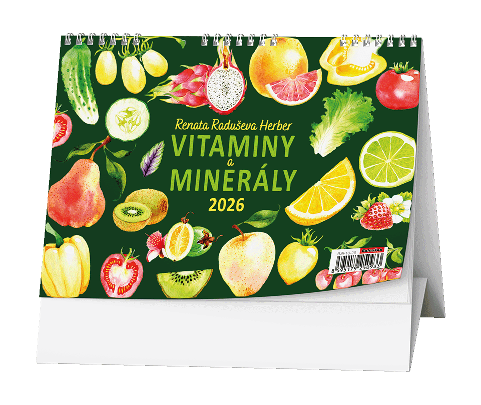 Stolní kalendář Renaty Raduševy Herber s týdenním kalendáriem. Kalendář je zajímavý svými informacemi o vitamínech a minerálech. Papír: G print, 100 g/m2 Obálka: křída lesk 135 g/m2 Stojánek je z kvalitní bílé lepenky 600 g/m2 Dělená kovová spirála "twin wire"   Možnosti potisku kalendáře Kalendář je možné nechat individuálně potisknout. Potisk se provádí na stojánek (na jednu nebo obě strany) různými způsoby dle složitosti a barevnosti loga či obrázku. Používá se digitální tisk, sítotisk, stejně jako nalepení potisku. Možné jsou i další úpravy jako třeba výměna titulní strany za vaši reklamní. Základní potisk se obvykle provádí pro minimální počet 50 ks kalendářů. V případě zájmu o jakoukoliv úpravu nás kontaktujte na e-mail zobac@papirnictvioskarek.cz nebo telefonicky na tel. 608 939 293. Rádi s Vámi probereme veškeré možnosti. Zakupte produkt Stolní kalendář 2026 Baloušek - Vitamíny a minerály Renaty Raduše Herber z kategorie Kalendáře, diáře | Stolní kalendáře 2026 | Obrázkové | Baloušek od výrobce Baloušek za cenu 52 Kč.