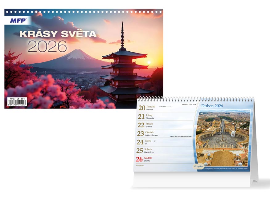 Stolní kalendář na rok 2026 s názvem Krásy světa. Kochejte se fotkami krásných míst z celého světa a inspirujte se, kam na dovolenou. Vhodný pro zapisování důležitých poznámek, k organizování různých událostí každodenního života. V KALENDÁŘI NAJDETE: přehled roku 2026 malý kalendář roku 2027 plánovací kalendář 2026 státní svátky jmeniny názvy a fáze měsíce počet týdnů v roce prostor na poznámky SPECIFIKACE: Kalendárium: týdenní Vazba: vinutá spirála Počet stran: 58 Rozměry: 230 x 145 mm Plocha pro potisk: 230 x 30 mm Možnosti potisku kalendáře Kalendář je možné nechat individuálně potisknout. Potisk se provádí na stojánek (na jednu nebo obě strany) různými způsoby dle složitosti a barevnosti loga či obrázku. Používá se digitální tisk, sítotisk, stejně jako nalepení potisku. Možné jsou i další úpravy jako třeba výměna titulní strany za vaši reklamní. Základní potisk se obvykle provádí pro minimální počet 50 ks kalendářů. V případě zájmu o jakoukoliv úpravu nás kontaktujte na e-mail zobac@papirnictvioskarek.cz nebo telefonicky na tel. 608 939 293. Rádi s Vámi probereme veškeré možnosti. Zakupte produkt Stolní kalendář 2026 MFP - Krásy světa z kategorie Kalendáře, diáře | Stolní kalendáře 2026 | Obrázkové | MFP od výrobce MFP Paper za cenu 66 Kč.