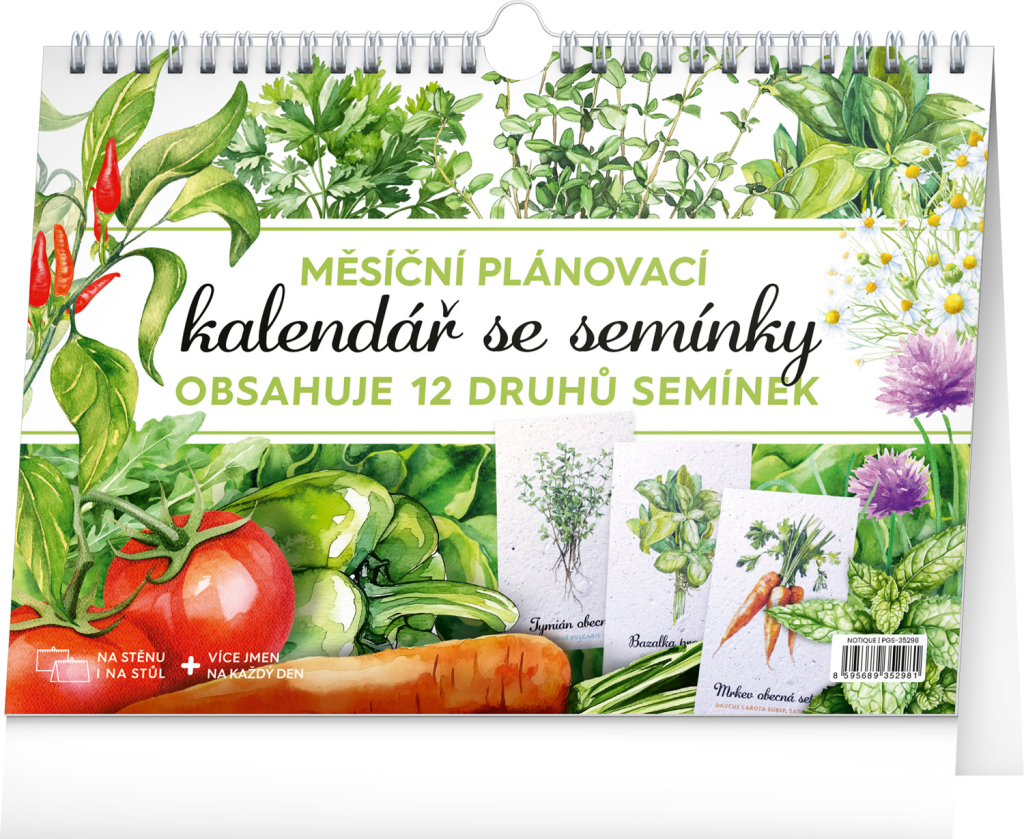 Objevte jedinečný stolní kalendář, který vám každý měsíc nabídne nejen dostatek prostoru na poznámky, ale i semínka rostlin, jež si můžete snadno vypěstovat doma. Stačí zasadit speciální semínkový papír do hlíny, zalévat a sledovat, jak vám rostou rajčata, bazalka, meduňka a další bylinky či zelenina. Ideální pro všechny, kteří chtějí zažít radost z pěstování a mít kousek zahrádky přímo u sebe doma. Obahuje měsíční kalendárium s českými svátky a jmeninami a 12 archů speciálního papíru se semínky.   Možnosti potisku kalendáře Kalendář je možné nechat individuálně potisknout. Potisk se provádí na stojánek (na jednu nebo obě strany) různými způsoby dle složitosti a barevnosti loga či obrázku. Používá se digitální tisk, sítotisk, stejně jako nalepení potisku. Možné jsou i další úpravy jako třeba výměna titulní strany za vaši reklamní. Základní potisk se obvykle provádí pro minimální počet 50 ks kalendářů. V případě zájmu o jakoukoliv úpravu nás kontaktujte na e-mail zobac@papirnictvioskarek.cz nebo telefonicky na tel. 608 939 293. Rádi s Vámi probereme veškeré možnosti. Zakupte produkt Stolní měsíční plánovací kalendář se semínky 2026 NOTIQUE, 30 x 21 cm z kategorie Kalendáře, diáře | Stolní kalendáře 2026 | Obrázkové | Presco Group od výrobce Presco Group za cenu 215 Kč.