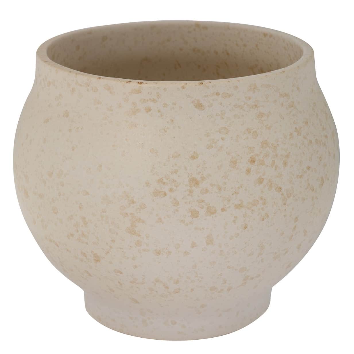 Obal na květiny je vyrobený ručně z keramiky v krémově bílé barvě, kterou pokrývá matná glazura s jemně kropenatým vzorem.