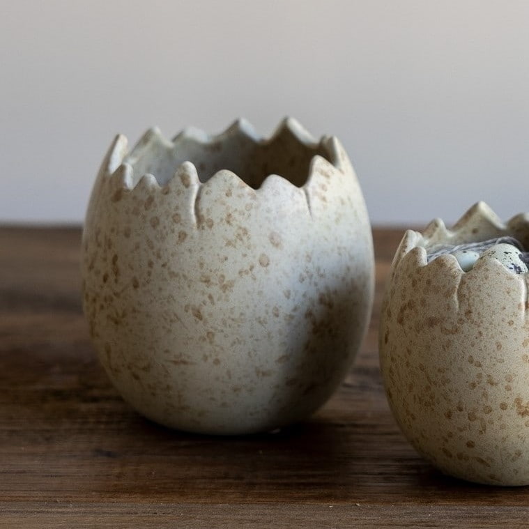 Skořápka je vyrobena ručně z keramiky, kterou pokrývá béžová glazura s jemně kropenatým vzorem. Decentně pololesklý finiš pak dodává této velikonoční dekoraci na luxusnějším dojmu.