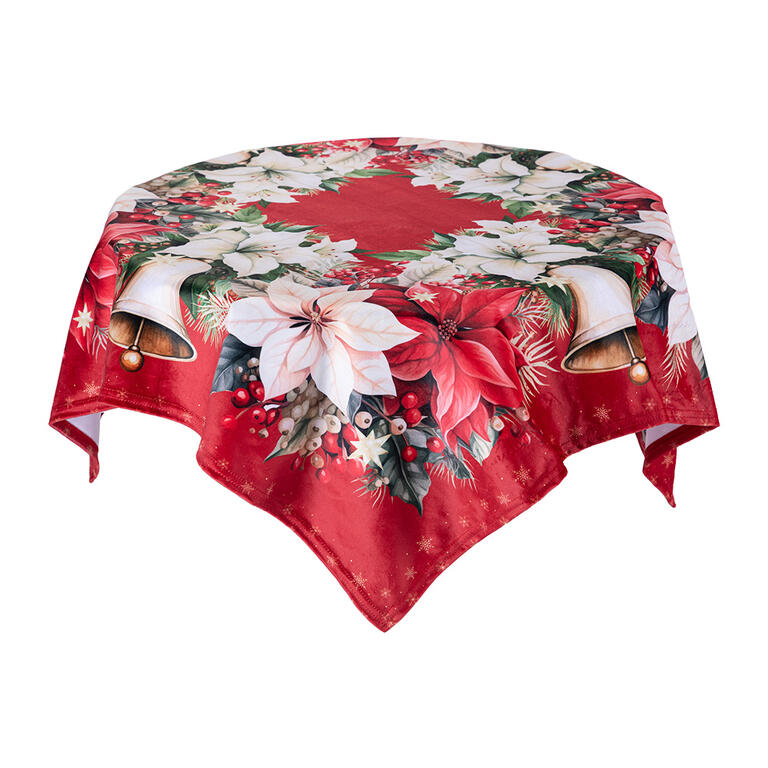 Originální sváteční ubrus s nádhernými motivy vánoční hvězdy a zvonků na tmavě červeném podkladu navodí u vás doma ten pravý pocit útulna. Sametově hebké, měkké a poddajné mikrovlákno je velice příjemné na dotek.