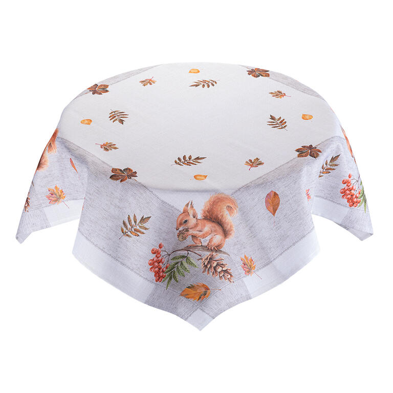 Středový ubrus na stůl s roztomilým motivem veverek navodí příjemnou podzimní atmosféru. Kvalitní a pevný materiál, který se snadno udržuje, rychle schne a téměř se nemusí žehlit.