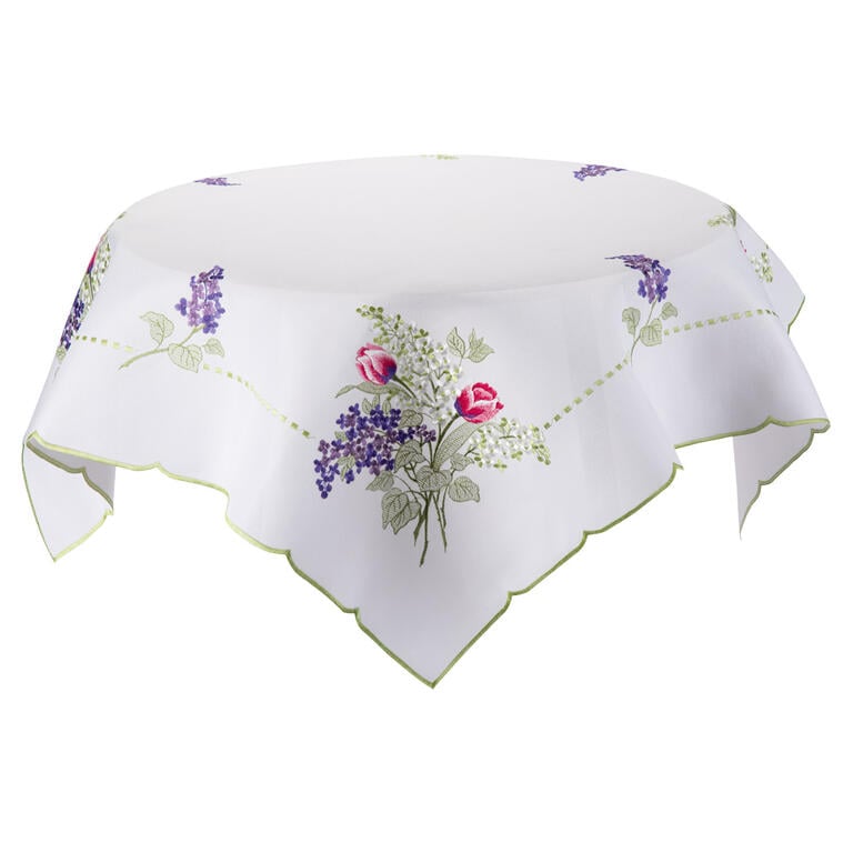 Nádherný ubrus s výšivkou jarních květů a jemně tvarovaným okrajem bude půvabnou ozdobou vašeho stolu po celý rok. Lehce se udržuje a rychle schne.