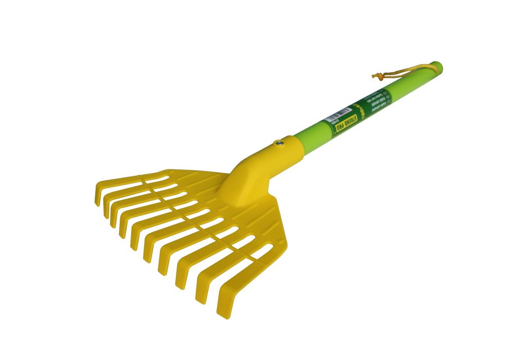 Celoplastové dětské nářadí s násadou. Toto nářadí je velmi lehké a je určeno nejen pro malé pomocníky, ale je vhodné jako příruční nářadí na cesty. Využít je lze např. při kempování, úpravě hrobů, nebo všude tam, kde je obtížné dovážet klasické nástroje. Celková délka: 42 cm Počet lamel: 10 Šířka hrabiček: 180 mm