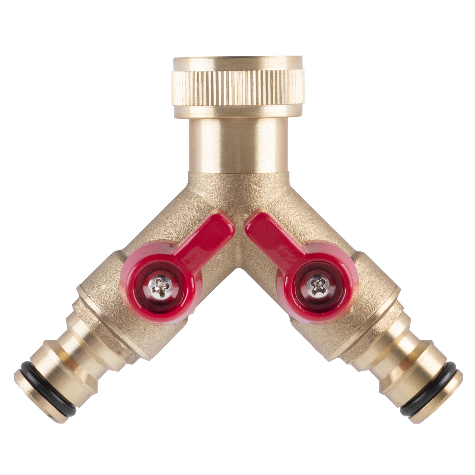 Mosazná rozdvojka typu Y s vnitřním závitem pro montáž na ventil a dvěma adaptéry na rychlospojku. Oba vývody jsou opatřeny uzávěry a je možné je používat odděleně, nebo dohromady.