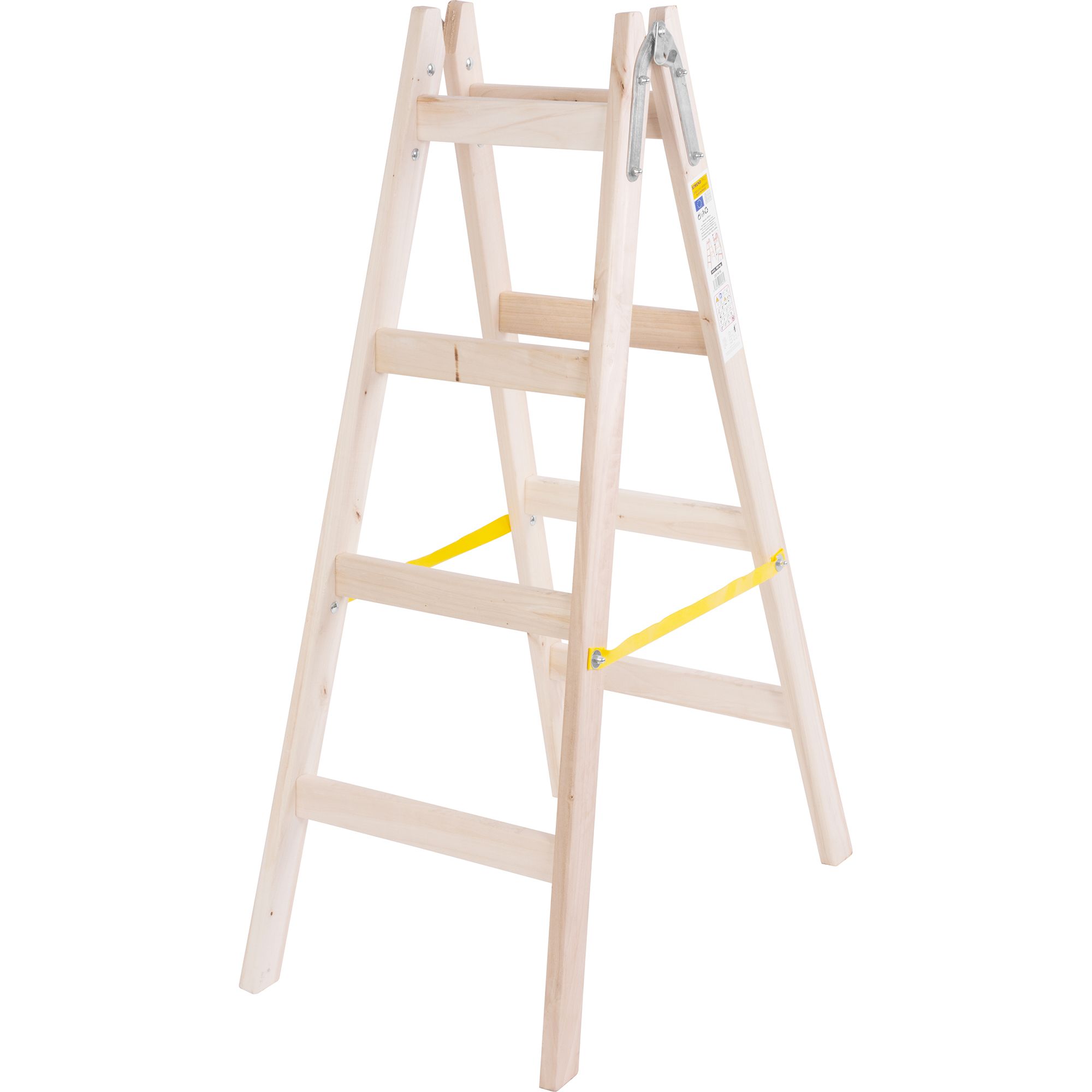 Dvojitý dřevěný žebřík se 4 příčkami se vyznačuje pevnou a stabilní konstrukcí, která zaručuje bezpečnou práci ve výšce. Je vyrobený ze dřeva a je opatřen kovovými pozinkovanými částmi vysoké kvality. Skvělou funkcí jsou kolmé příčky směrem k zemi pro ještě bezpečnější využívaní štaflí. Nylonový pás zamezuje rozevření žebříku. Navíc disponuje praktickým háčkem na zavěšení vědra. Vyrobeno v EU.Počet příček:4Pracovní výška (A):2,25 mVýška na stání (B):1,27 mŠířka štaflí (C):0,5 mDélka složeného žebříku (D):1,3 mNosnost:150 kgHmotnost:5,8 kg