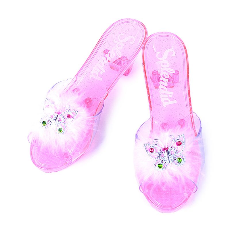 Střevíčky princezna růžové Exkluzivní střevíčky přece nesmí chybět žádné princezně! Střevíčky o délce 20 cm jsou vyrobeny z PVC a zdobeny peřím a úchvatným motýlkem. Navíc se celé třpytí!