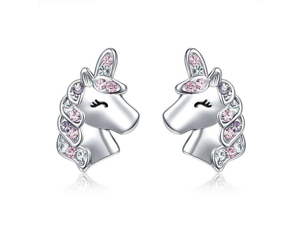 - Náušnice ve tvaru jednorožce, hřívu zdobí zirkony růžové, modré a fialové barvy.