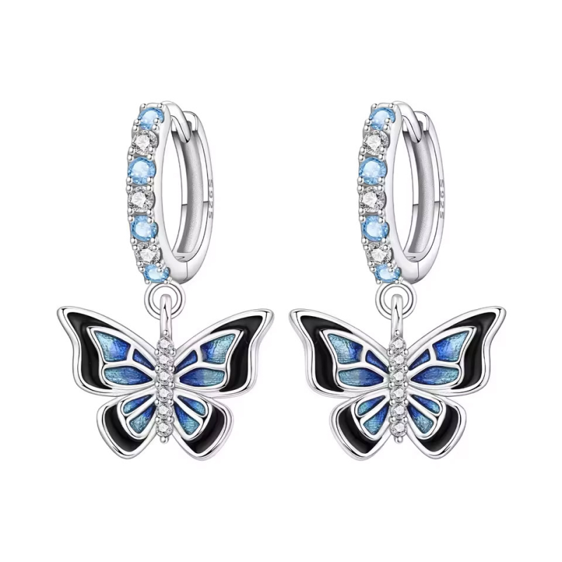 Stříbrné visací náušnice s motivem motýla v modro-černém provedení působí elegantně a zároveň výrazně. Jemně tvarovaná křídla kombinují hluboký černý akcent s duhovými odstíny modré, které se mění podle dopadu světla. Horní kruhová klapka je zdobena střídáním světle modrých a čirých kamenů, jež dodávají šperku sofistikovaný třpyt.Precizní linie stříbrného rámování podtrhují symetrii motýlích křídel a zvýrazňují jejich detailní členění. Střed motýla je osazen drobnými čirými kameny, které vytvářejí jemný, luxusní efekt. Celek působí harmonicky, moderně a přesto nadčasově.Díky pohodlnému zapínání na klapku jsou náušnice vhodné pro každodenní nošení i slavnostní příležitosti. Motýl symbolizuje proměnu, svobodu a nový začátek – a právě tuto lehkost a eleganci šperk přináší do každého outfitu. 💡 Tip: Vyniknou i s jednoduchou bílou halenkou nebo džínovým outfitem. Motýl se stane dominantním, ale stále jemným akcentem.