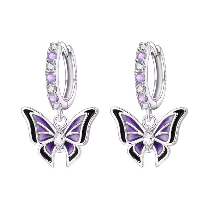 Stříbrné visací náušnice s motivem motýla v odstínech fialové představují spojení elegance a tajemné hloubky. Kontrast tmavého lemování a jemně prosvětlených křídel vytváří působivý vizuální efekt, který okamžitě upoutá pozornost. Střed motýla zdobí výrazný čirý kámen s precizním brusem, jenž šperku dodává luxusní jiskru.Horní kruh je osazen střídáním čirých a fialových kamenů, které barevně navazují na samotný motiv. Celek působí vyváženě, harmonicky a současně originálně. Design je propracovaný do detailu – jemné linie křídel i tvar motýla vytvářejí lehkost, která působí vzdušně a sofistikovaně.Tyto náušnice nejsou jen doplňkem, ale výrazem osobního stylu. Fialová barva symbolizuje noblesu, kreativitu a vnitřní sílu. Šperk tak osloví ženu, která se nebojí jemné výjimečnosti a hledá detail, jenž podtrhne její osobnost. 💡 Tip: Zkombinujte s jednoduchým kostýmkem nebo jednobarevným topem. Motýl se stane dominantou outfitu.