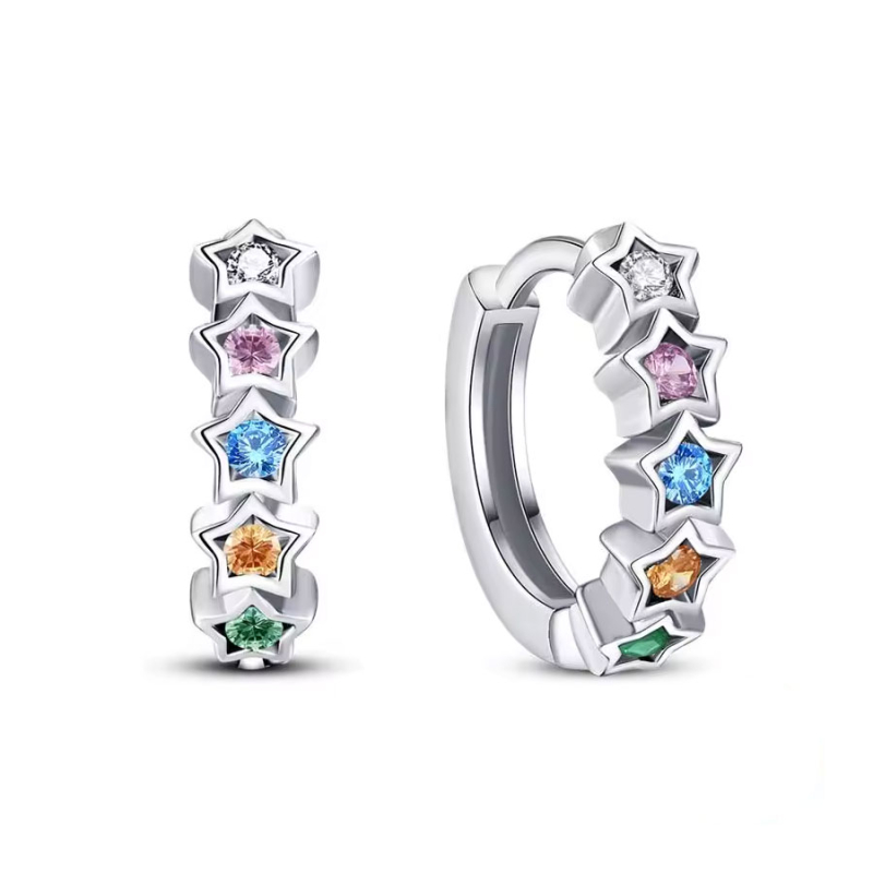 Stříbrné náušnice ve tvaru jemných kroužků zdobené barevnými hvězdičkami působí hravě, a přesto elegantně. Každá hvězda ukrývá třpytivý zirkon v jiném odstínu – od čiré jiskry přes růžovou a modrou až po teplé a svěží tóny, které spolu vytvářejí harmonickou a radostnou kompozici. Lesklé stříbro podtrhuje čistotu linií a nechává vyniknout barevným detailům.Design je lehký, moderní a dokonale vyvážený. Díky praktickému zapínání se náušnice pohodlně nosí po celý den a přirozeně se přizpůsobí pohybu. Barevné kameny zachytávají světlo z různých úhlů a dodávají šperku živost, aniž by působil výrazně či rušivě.Tento model je ideální volbou pro ženy, které milují jemné detaily s nádechem originality. Hvězdicový motiv symbolizuje sny, radost a osobitost, zatímco kombinace barev přináší optimistickou energii do každého dne. 💡 Tip: Noste je k jednoduché bílé košili nebo jemnému svetru. Barevné hvězdičky dodají outfitu svěžest a nenápadný šmrnc.