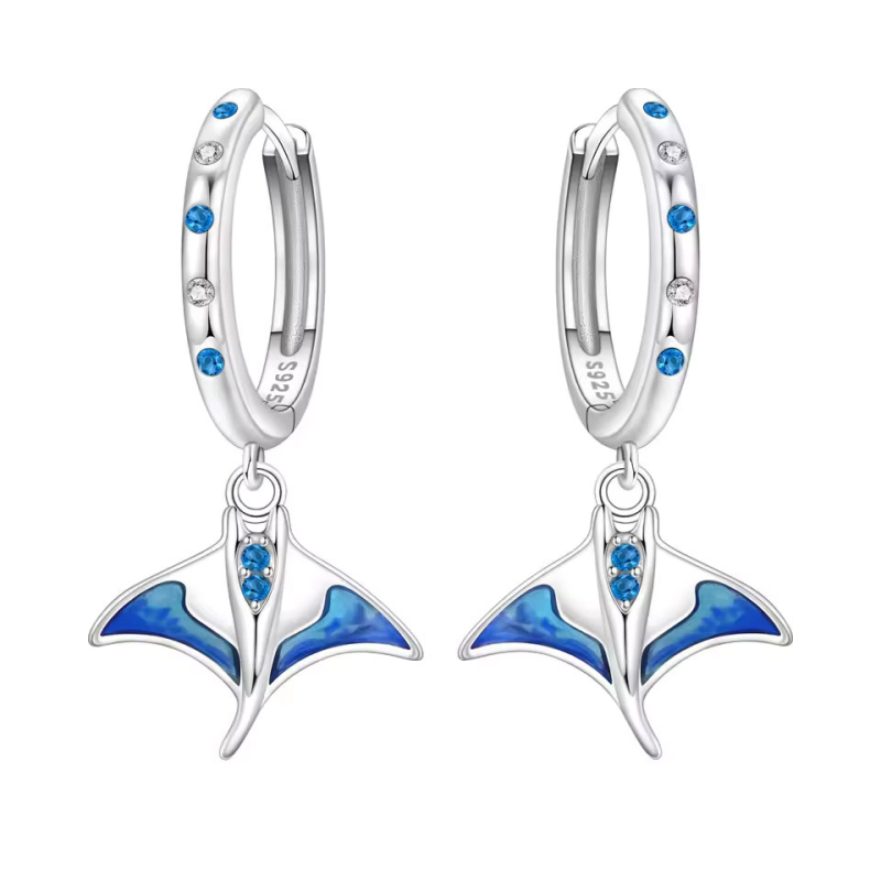 Jemný pohyb manty, která se tiše vznáší nad korálovým útesem, patří k nejsilnějším zážitkům z tropických moří. Právě touto elegancí a lehkostí se inspirují tyto stříbrné visací náušnice s motivem manty, doplněné modrými kameny evokujícími průzračnou lagunu. Připomínají chvíle, kdy stojíte po kotníky v teplé vodě a díváte se do nekonečné modři.Lesklé stříbro podtrhuje ladné linie mořského tvora, zatímco sytě modré detaily dodávají šperku hloubku a svěží letní charakter. Kroužky zdobené kameny vytvářejí harmonický přechod mezi jemným třpytem a výrazným motivem. Náušnice působí lehce, ale zároveň nepřehlédnutelně – přesně tak, jak má vypadat doplněk na exotickou dovolenou.Jsou ideální volbou pro chvíle na Maledivách, Seychelách, v Thajsku či na Bali, kde lze manty skutečně spatřit v jejich přirozeném prostředí. Stanou se stylovou připomínkou cest, slunce a teplého písku pod nohama. Každý pohyb náušnic při chůzi jako by znovu vyprávěl příběh oceánu. 💡 Tip: Perfektní doplněk k lehkým šatům, lněným kompletům či plážovému outfitu. Modré tóny krásně zvýrazní opálenou pokožku.