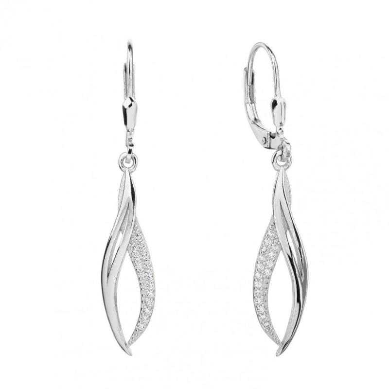 Tyto visací stříbrné náušnice okouzlují originálním, vlnitě propleteným designem, který připomíná jemný pohyb hedvábné stuhy. Jedna linie je vysoce lesklá, druhá osazená jemnými zirkony, které přirozeně zachycují světlo při každém pohybu. Výsledkem je harmonické spojení lesku, elegance a lehkosti.Náušnice jsou vyrobeny z kvalitního stříbra 925/1000 a opatřeny rhodiovou úpravou, která zvyšuje jejich lesk, chrání povrch proti oxidaci a zajišťuje dlouhodobou barevnou stálost. Zapínání na klapku je praktické, bezpečné a pohodlné i pro celodenní nošení.Jejich moderní, avšak nadčasový tvar z nich dělá perfektní doplněk pro slavnostní příležitosti i běžné nošení. Jemný třpyt zirkonů a precizní zpracování vytváří dojem luxusu, díky kterému si tyto náušnice zamiluje každá žena s citem pro detail. 💡 Tip: Tyto náušnice krásně doplní minimalistický stříbrný řetízek se zirkonovým přívěskem – vytvoříte tak elegantní soupravu pro večerní akce i pracovní schůzky.
