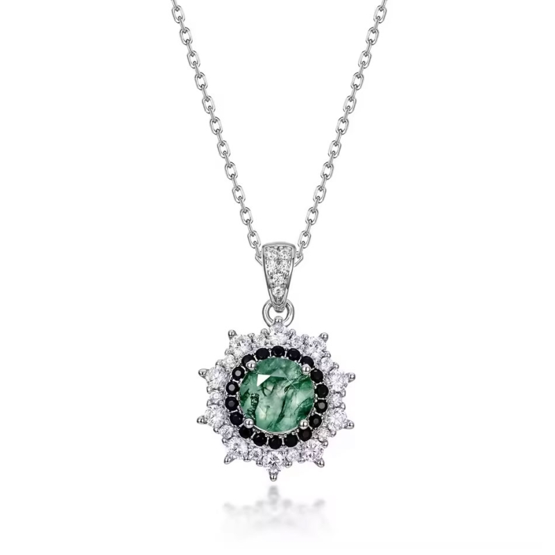 Okouzlující stříbrný náhrdelník s mechovým achátem ve tvaru květinového medailonu je jedinečným spojením přírody a elegance. Hlavní dominantou přívěsku je kulatý kámen se zelenými inkluzemi, které připomínají mech v kapce rosy. Kamínek je zasazený do jemného kruhu z černých a čirých zirkonů, které vytvářejí nádherný kontrast a záři.Jemný řetízek nechává přívěsek krásně vyniknout na dekoltu a dodává celému šperku vzdušnost a nadčasovou eleganci. Díky univerzálnímu designu se skvěle hodí pro každodenní nošení i pro slavnostní příležitosti. Harmonické propojení zemitých tónů achátu s brilantním třpytem zirkonů vytváří vizuálně poutavý efekt.Tento náhrdelník potěší všechny milovnice přírodních drahých kamenů a zároveň zaujme precizním zpracováním a noblesním dojmem. Je dokonalou volbou pro ženy, které hledají osobitý šperk s duší. 💡Tip: Náhrdelník se skvěle kombinuje s jednoduchým bílým topem nebo šaty v přírodních tónech. Zvýrazněte jeho krásu i jemnými náušnicemi s přírodním kamenem.