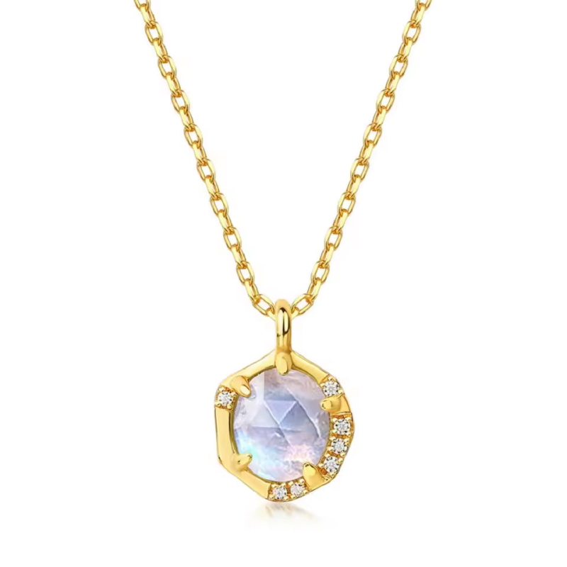 Objevte jemnou eleganci v podobě tohoto náhrdelníku ze stříbra ryzosti 925/1000, který vás okouzlí svou nadčasovou krásou. Dominantním prvkem šperku je ručně fasovaný přírodní měsíční kámen – polodrahokam, který vyniká svou jemnou mléčnou září a magickým duhovým leskem. Zlacený povrch náhrdelníku dodává celku luxusní nádech, který podtrhuje ženskost a sofistikovanost.Měsíční kámen, známý také jako moonstone, je symbolem vnitřní rovnováhy a intuice. V tomto šperku se snoubí se třpytivými zirkony, zasazenými asymetricky v dekorativní obrubě, která připomíná zlaté objetí přírody. Náhrdelník tak působí harmonicky a zároveň výjimečně – ideální volba pro ženy, které hledají osobitý šperk s hloubkou a významem.Díky decentnímu designu a jemnému řetízku se náhrdelník hodí jak pro každodenní nošení, tak i pro slavnostní příležitosti. Skvěle vynikne samostatně, ale také v kombinaci s dalšími šperky ve zlatém nebo pastelovém tónu. S tímto klenotem získáváte nejen krásu, ale i špetku tajemství ukrytou v měsíčním svitu. 💡Tip: Náhrdelník je skvělou volbou k hedvábným halenkám, šatům v barvě champagne nebo jemně růžové, ale stejně působivě zazáří i v kombinaci s bílou košilí a džínami. Doplníte-li jej o minimalistické náušnice ve stejném tónu, vznikne dojem přirozené elegance a vytříbeného vkusu.