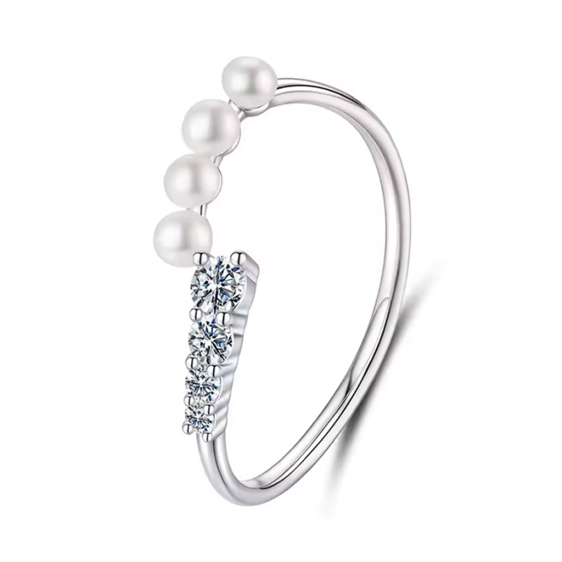 Tento elegantní dámský prsten z pravého stříbra 925/1000 zaujme svým netradičním a vzdušným designem. Precizní zpracování nechává vyniknout kontrastu lesklého kovu, jemných bílých perel a třpytivých kamínků moissanitu. Prsten má otevřený tvar a díky nastavitelné velikosti (výchozí velikost je 57) se dokonale přizpůsobí většině prstů.Lesk moissanitů v kombinaci s perlovým dekorem vytváří sofistikovaný vzhled, který podtrhne vaši ženskost a smysl pro detail. Prsten působí lehce, přesto však výrazně, a je ideálním doplňkem pro každodenní nošení i slavnostní příležitosti. Minimalistické zpracování a luxusní dojem z něj činí šperk, který vynikne i samostatně.Nastavitelný prsten je vyroben ze stříbra s odolnou rhodiovanou úpravou, která zabraňuje oxidaci a prodlužuje jeho lesk. Díky vybraným materiálům a jemné kombinaci perel a moissanitů jde o šperk, který v sobě spojuje eleganci i moderní jemnost. Vhodný jako osobní ozdoba i jako dárek pro milovnice perlových detailů. 💡Tip: Noste prsten samostatně pro minimalistický look nebo jej zkombinujte s jemným stříbrným náramkem s perličkami. Skvěle vynikne na ruce s upravenou manikúrou v nude odstínech.
