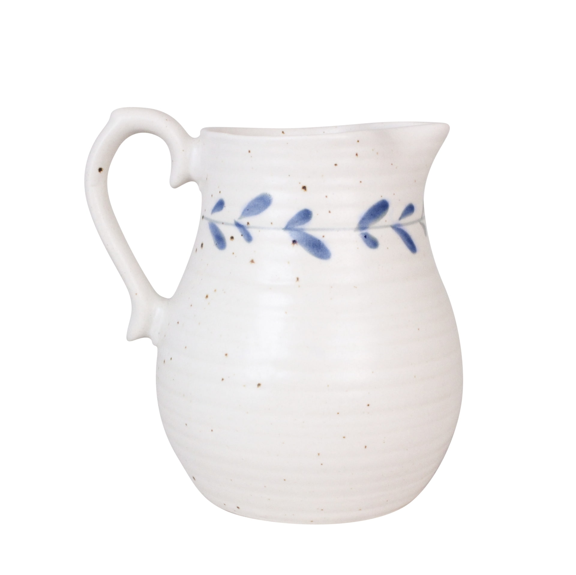Jeho ručně malovaný okraj s dekorativními modrými listy a jemně kropenatý vzor po celé ploše vytváří jedinečný vzhled, který dodá každému stolu šmrnc. Každý džbán je originální, protože jasnost teček a odstín hlíny se mění podle teploty výpalu, což zaručuje, že váš džbán bude opravdu výjimečný.