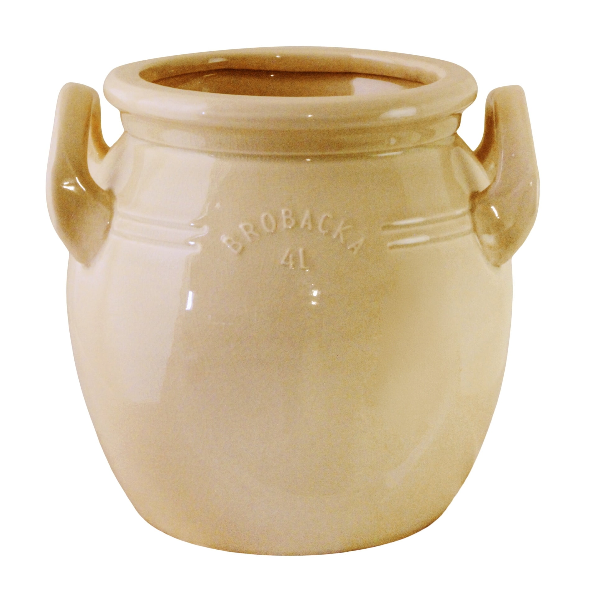Tradiční baculatý tvar nádoby, decentní lesk glazury v zastřené žluté barvě a dvě ucha se hodí jak zejména do rustikálních a venkovských interiérů.