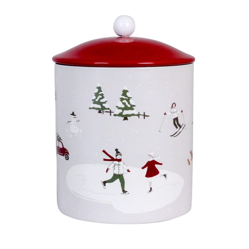 Vysokou kulatou dózu zdobí krásný motiv ilustrace znázorňující předvánoční pohodu v zasněženém městečku.