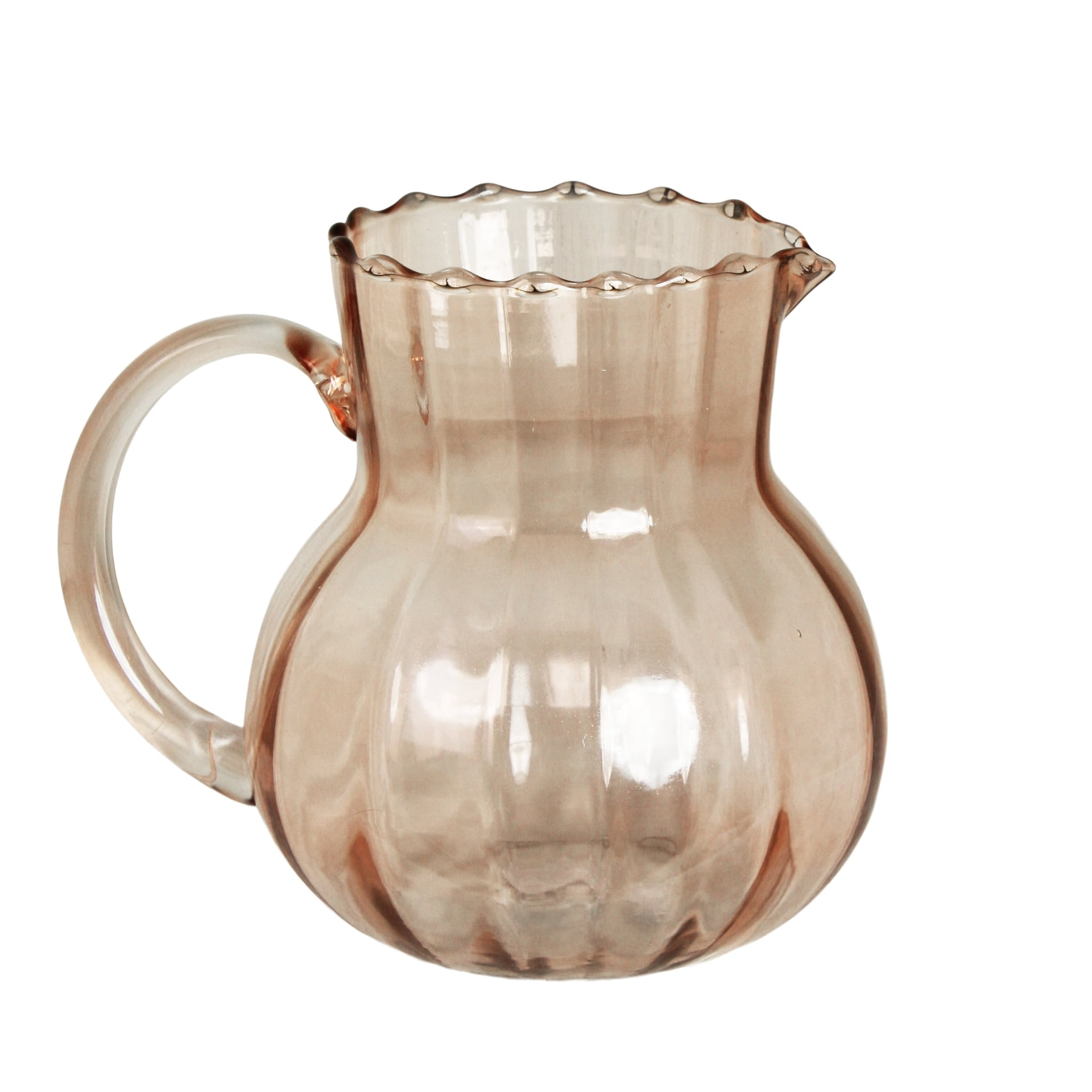 Strömshaga Skleněný džbán Tyra Pink 1350 ml, růžová barva, oranžová barva, sklo. Džbán Tyra od švédské značky Strömshaga na první pohled zaujme svoji krásnou broskvově růžovou barvou skla, které je ozvláštněno elegantním vroubkováním. Spojuje tak funkčnost s estetikou – skvěle poslouží při servírování vody, domácí limonády nebo míchaných nápojů.