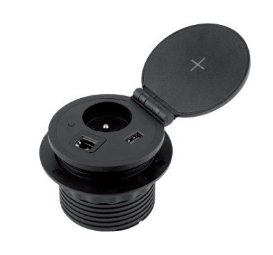 Strong elektrozásuvka otevírací- barva černá-1 x 230 V- 1 x USB nabíječka 5V, 2,4A, 1 x bezdrátová nabíječka ve víku v otevřené poloze- Napájecí kabel 2 m- Průměr vrtání 80 mm- francouzský typ s uzemňovacím kolíkem (standard pro CZ a SK)- schuko typ s uzemňovacím na stranách zásuvky (standard pro DE, AT a HU)