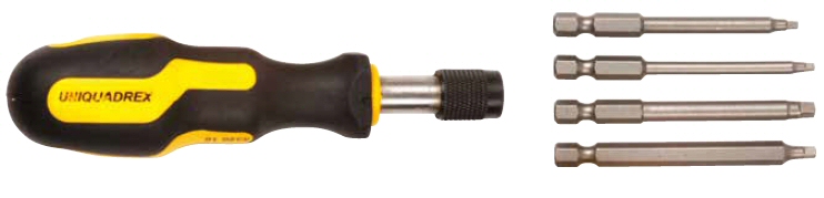 sada obsahuje:kvalitní šroubovák pro výměnné bity1x bit 0 délka 75mm1x bit 1 délka 75mm1x bit 2 délka 75mm1x bit 3 délka 75mm