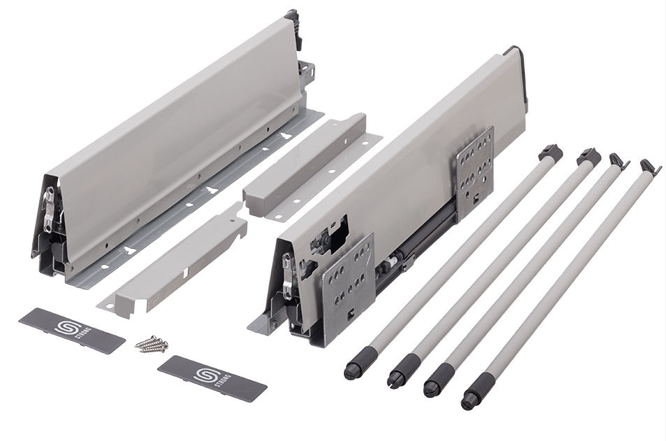 Technická specifikace- hladký design bočnic- synchronizovaný celovýsuv s tlumeným dotahem- nosnost 35kg- integrované 3D nastavení čela- minimální výšková světlost otvoru pro zásuvku 225mm- minimální vnitřní hloubka korpusu 460mmSada obsahuje- bočnice L+P- výsuv L+P- držák zad L+P- reling L+P- držák čela 2x- krytka s logem Strong 2xPozor dřevěné čelo, dno a záda zásuvky nejsou součástí- rozměry přířezů viz obrázek číslo 2Pro použítí jako vnitřní zásuvka je nutno dokoupit:- 1x držák čelního profilu- 1x čelní profil- 1x reling- 1x úchytka pro čelní zásuvkuVolitelné příslušenství- vnitřní děleníMontážní pomůcky- označovač čela- šablona pro reling- označovací šablona Strong